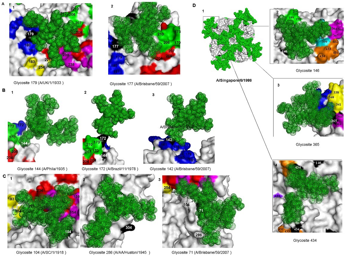 (A) The glycans attached to glycosites 179 (A-1) and 177(A-2) of HA as well as the surrounding regions of the trimeric proteins. (B) The glycans attached to glycosites 144 (B-1), 172 (B-2) and 142(B-3) of HA as well as the surrounding regions of the trimeric proteins. (C) The glycans attached to glycosites 104 (C-1), 286 (C-2) and 71(C-3) of HA as well as the surrounding regions of the trimeric proteins. (D) The structure of the glycosylated NA tetramer from A/Singapore/6/1986 and the glycans attached to the glycosites in region C (including glycosites 146, 365 and 434). The surface of the HA proteins is shown in white. The glycosites and glycans are colored in black and green, respectively. The receptor-binding site (RBS) and the five antigenic sites of HA as well as t he enzymatic active site and antibody binding sites of NA are highlighted in the same colors as in FIG. 3C and 3D, respectively. The amino acid locations are numbered according to the HA of SC 1918 and the NA of BM 1918 numbering. The glycosites are numbered in white.